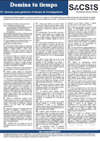 «La guía SACSIS es una excelente herramienta de gestión del tiempo. A través de unas normas básicas de administración de las actividades y algo de disciplina personal es posible aumentar la capacidad de concentración y efectividad en el trabajo. Todos estos pequeños y grandes secretos encierran un gran sentido común que debe ser integrado en el día a día cada vez nos va perdiendo en asuntos que dispersan la esencia y la ilusión con la que todo científico inicia su camino»